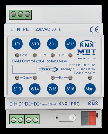 (SCN-DAL642.04 > 2 x 64 EVGs/16 DALI groups, 2 DALI outputs)