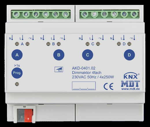 The MDT Dimming Actuator receives KNX/EIB telegrams and dimms/switches up to 4 independent electrical loads.